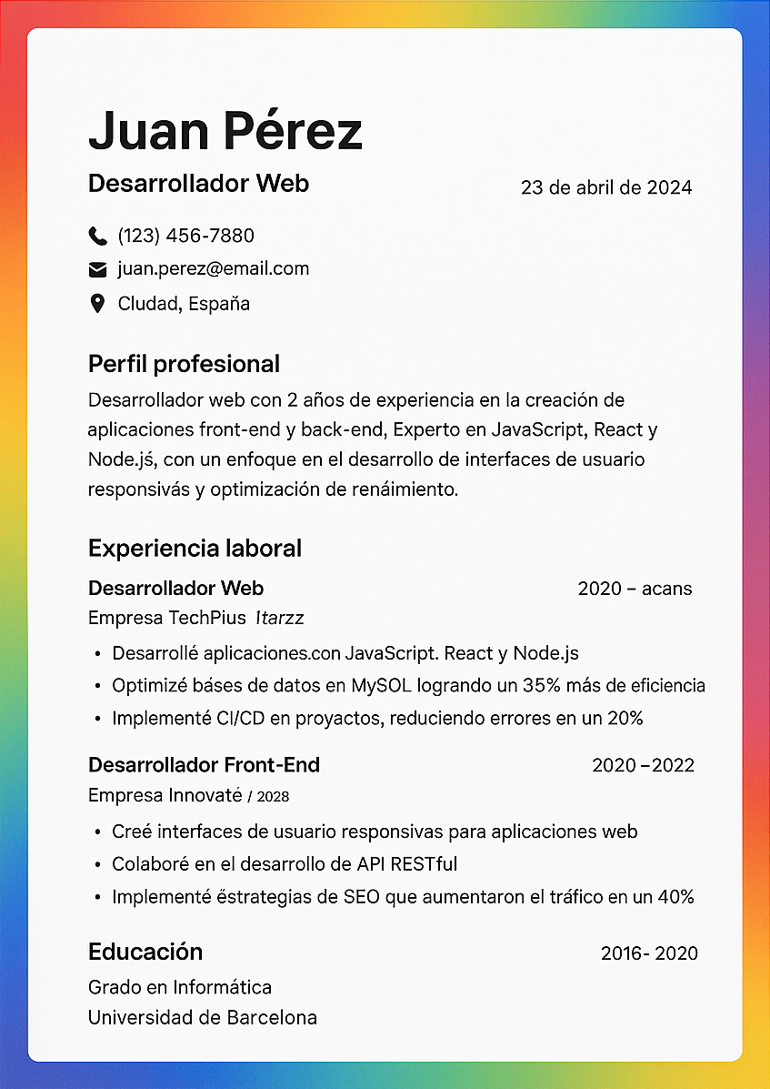 Juan Pérez — Desarrollador Web Empresa TechPlus (2022 - Actualidad) - Desarrollé aplicaciones con JavaScript, React y Node.js. - Optimicé bases de datos en MySQL logrando un 35% más de eficiencia. - Implementé CI/CD en proyectos, reduciendo errores en un 20%.JavaScript React Node.js SQL